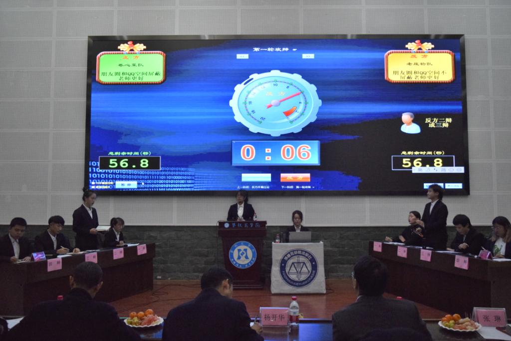 本次比赛共有四支队伍参加,分两轮举行,围绕“朋友圈和QQ空间是否应该屏蔽老师更好”与“我不合群,我是否需要改变”依次展开辩论。正反双方以高度概括性的语言陈述各方观点,辩手紧扣当下的时政热点,从生活实际出发,对两个辩题做出独到而深刻的分析,唇枪舌剑,言词锋利,为现场观众展示了一场精彩绝伦的比赛。经过激烈的角逐,比赛最终由对“对对对队”(曹婉萱、王婉清、余文、泽郎若满)获得本届辩论赛的冠军,“对对对队”二辩王婉清以及“卷心菜队”四辩朱月凭借出色的表现荣获最佳辩手称号。各评委对参赛队伍逐一点评,并对本次成功举办辩论赛表示热烈的祝贺。