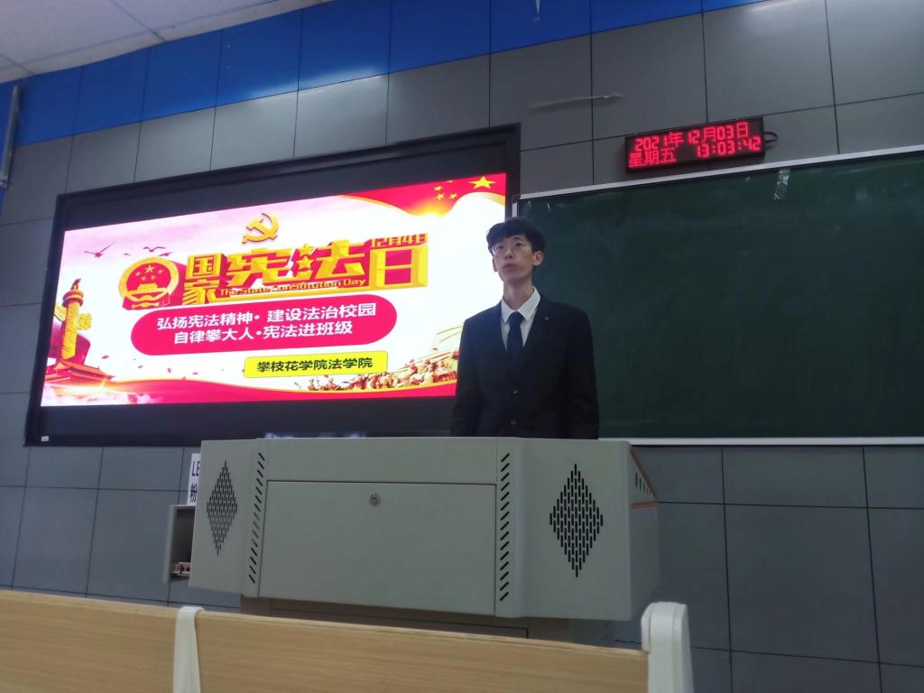 为弘扬宪法精神,加强校园法治教育,推动校园法治发展。公司开展为期一周的“弘扬宪法精神·建设法治校园——自律攀大人·宪法进班级 ”主题宣讲活动。12月3日下午普法宣讲团受邀为21级生化学院新生于1—2开展第五场弘扬宪法宣讲活动,出席本场活动的老师有宣讲团指导老师吴军华和生化学院21级辅导员黄山奇松。