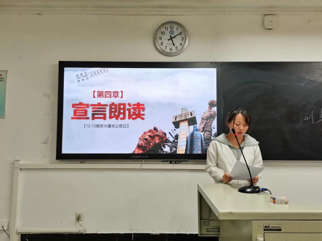 班会伊始,李崇玮简单介绍此次班会的基本流程,详细讲述了南京大屠杀的历史背景、历史意义、历史影响等内容,以PPT、视频、互动的方式向同学们展示了那段刻苦铭心的历史。同学们怀着沉痛的心情认真听讲,深刻体会到同胞们遭受侵略和掠夺的苦难。班会中,蔡淑君带领同学们一起宣读和平宣言,张帮梅发表“勿忘国耻,珍爱和平”演讲,倡导大家要化悲愤为力量,发奋图强,为祖国发展贡献力量。在观看《南京!南京!》电影的过程中,同学们看到了南京大屠杀这一屈辱历史的真相,身临其境地感受到南京大屠杀的惨绝人寰,让大家心灵深处的民族感重新苏醒。班会最后,王霞作总结发言,她表示同学们要深刻认识历史、铭记历史、勿忘国耻,务必树立珍爱和平、自强不息的坚定信念,为祖国屹立于世界之林而拼搏奋斗。