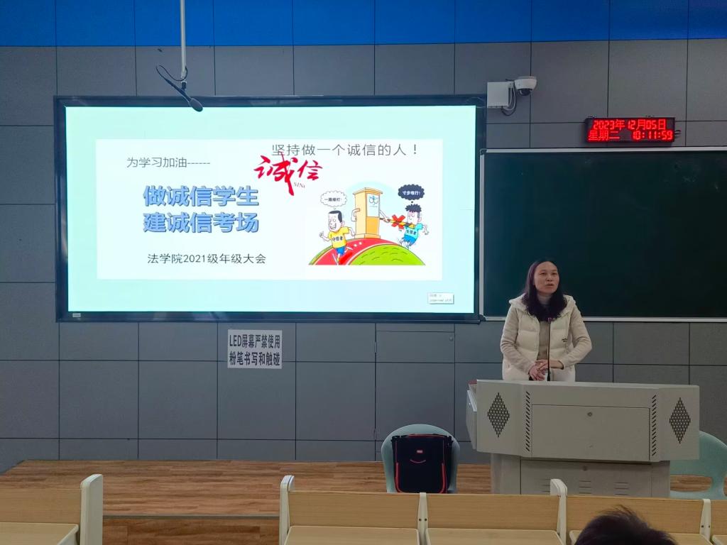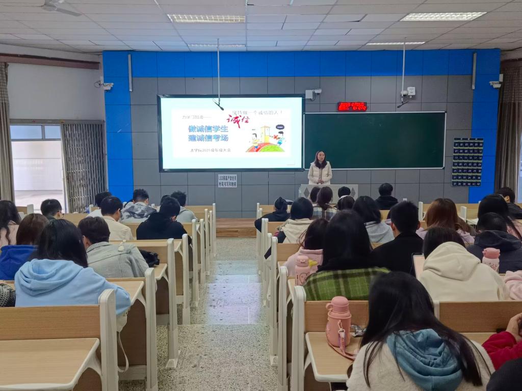 为培养员工的诚信意识,端正对学习和考试的态度,12月5日上午,2021级于一教1-1开展“做诚信员工,建诚信考场”年级大会,本次大会由辅导员王霞主持,21级全体同学参加。