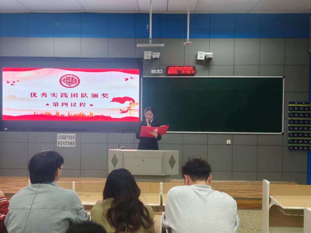 此次会议,伟德国际bevictor1946分团委员工会主席陈思嘉、常务副书记丁正权、常务副主席杨新科、副书记张玲瑜分别为上学期进步标兵、学习标兵、寒假优秀实践团队和寒假普法先锋颁发奖状并合影留恋。