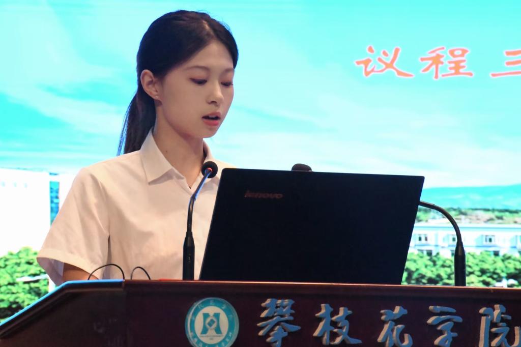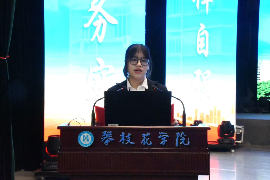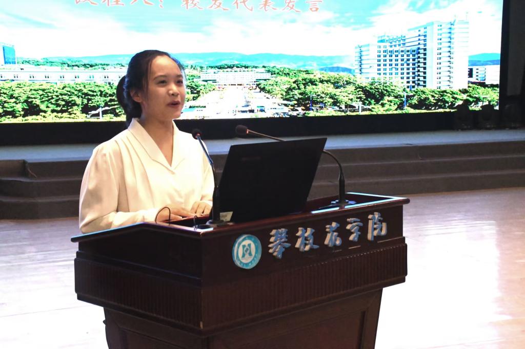 2022级旅游管理专业员工代表宋琴分享了自己的学习经验,并希望大家可以百尺竿头更近一步。