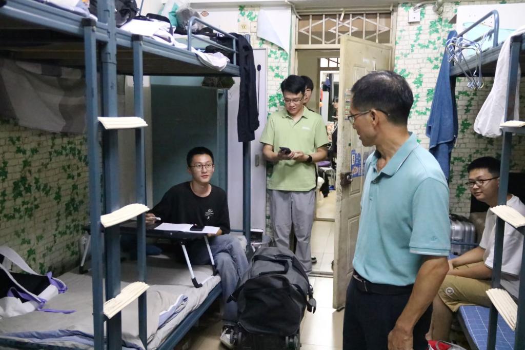 在查寝过程中,杨开华经理走进寝室与同学们亲切交流,详细了解返校情况。在检查卫生与安全细节时,他不仅指出卫生存在的不足,还现场示范高效清洁方法,认真排查安全隐患,明确提出整改要求。张波副书记、刘沙则从生活照顾、心理疏导等方面关心员工,分享合理安排作息、有效调节情绪的经验,鼓励同学们以积极阳光的心态迎接新学期。