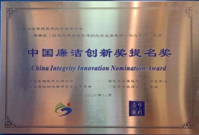 攀枝花市纪检监察学会申报的项目“打造跨界融合共建的纪检监察教研一体化平台——攀枝花纪检监察学院”获第二届“中国廉洁创新奖”大奖。